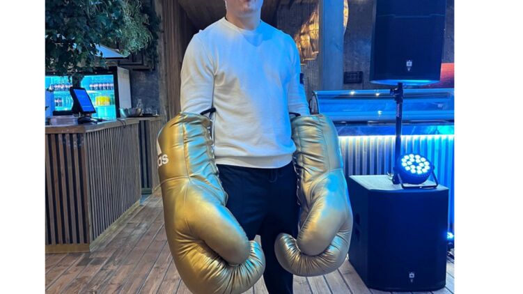 Александр Усик позировал в огромных золотых боксерских перчатках. Фото