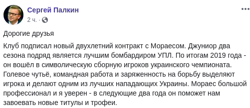 "Джуниор два сезона подряд является лучшим бомбардиром УПЛ. По итогам 2019 года - он вошёл в символическую сборную игроков украинского чемпионата. Голевое чутьё, командная работа и заряженность на борьбу выделяют этого игрока и делают одним из лучших нападающих Украины", - написал Сергей Палкин.