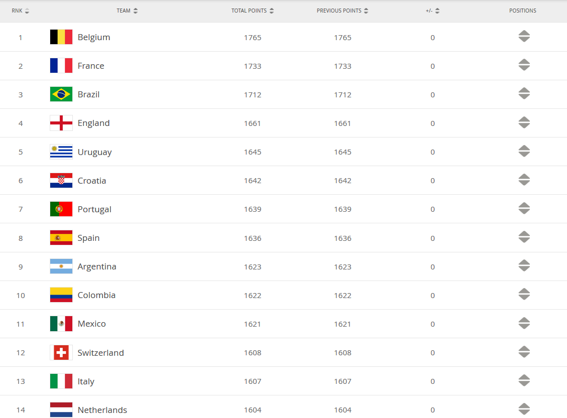 Тройка лидеров осталась без изменений - Бельгия, Франция и Бразилия. Сборная России в рейтинге ФИФА занимает 38 место. Отметим, что в рейтинге УЕФА национальная команда Украины занимает десятое место.