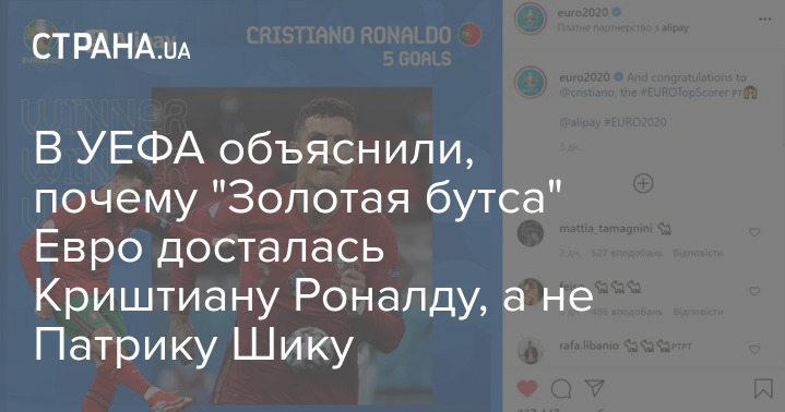 В УЕФА объяснили, почему "Золотая бутса" Евро досталась Криштиану Роналду, а не Патрику Шику