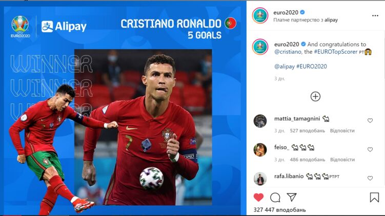 Это уже второе звание лучшего бомбардира континентального первенства для португальского футболиста. Первый раз Роналду стал лучшим бомбардиром Евро в 2012 году, когда стал автором всего трех голов и поделил награду с Марио Балотелли, Марио Гомесом, Аланом Дзагоевым, Марио Манджукичем и Фернандо Торресом, которые также забил по три мяча.