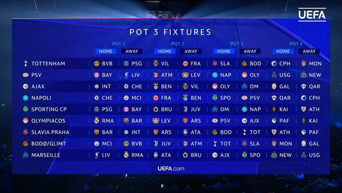 Соперники определены жеребьевкой по специальной компьютерной системе. Каждый клуб проведет по два матча с представителями каждой корзины – один дома и один на выезде.