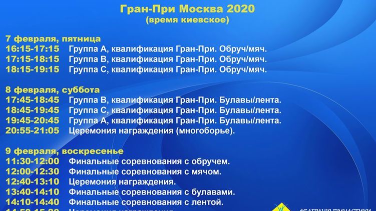 "Тренерским штабом сборной Украины было принято решение об участии наших спортсменок Мелещук Евы и Пограничной Кристины в Гран-при по художественной гимнастике, Москва, 7-9 февраля 2020 года. Пожелаем нашим девочкам удачи!" - говорится в сообщении.