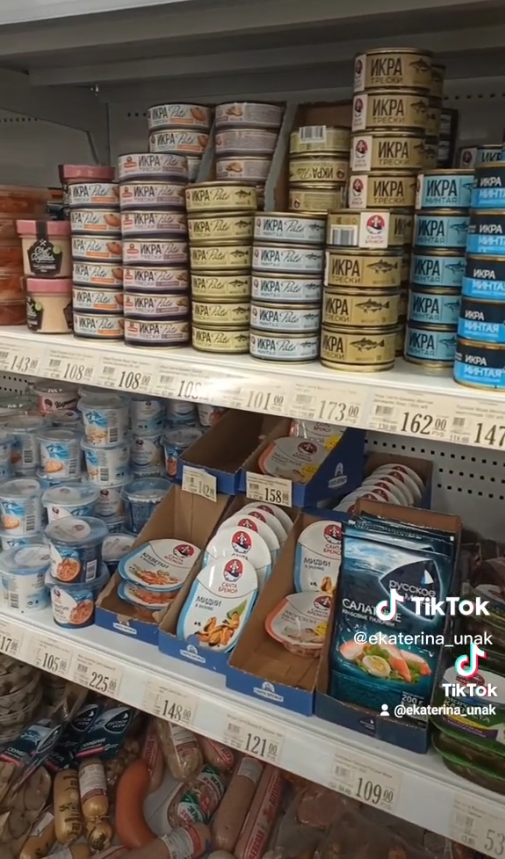 Судячи з роликів з місцевих супермаркетів, пачка рису чи гречки там коштує 100-150 рублів (50-70 гривень за курсу 2 до 1), упаковка сиру - 166 рублів (80 гривень), йогурт - 67 рублів (30 гривень), пельмені - 260-315 рублів за кілограм (130-160 гривень).