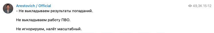 Радник ВП Олексій Арестович пише, що ракетний удар сьогодні є масштабним, закликає не ігнорувати повітряну тривогу.