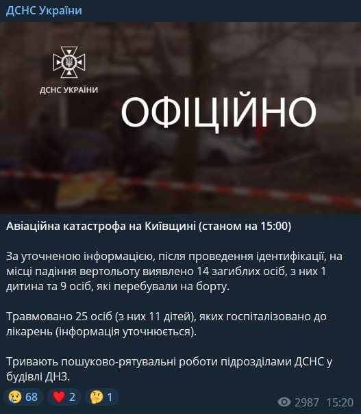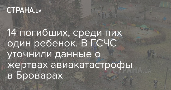 ДСНС знову уточнила дані щодо загиблих внаслідок краху вертольота у Броварах. За уточненою інформацією жертвами стали 14 осіб ( станом на 14:00 повідомлялося про 17 загиблих ).