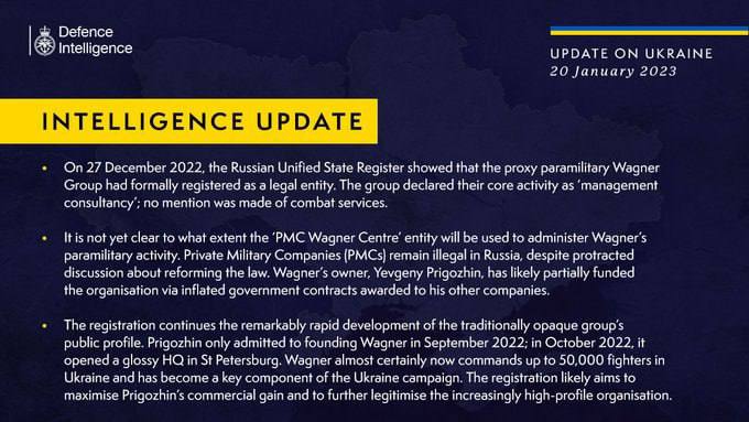 Так, 27 грудня Єдиний держреєстр Росії показав, що ПВК "Вагнер" офіційно зареєстровано як юридичну особу. Група заявила про свою основну діяльність як "консалтинг у галузі управління"; про військові завдання не згадувалося, повідомляє британська розвідка.