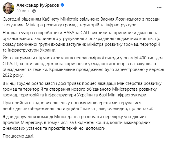"Сьогодні рішенням Кабінету Міністрів звільнено Василя Лозинського з посади заступника Міністра розвитку громад, територій та інфраструктури. Я доручив команді Міністерства розпочати перевірку всіх чинних проектів Мінрегіону, у тому числі за бюджетні кошти, кошти міжнародних фінансових установ та проектів технічної допомоги", - написав голова. Мінрегіону.