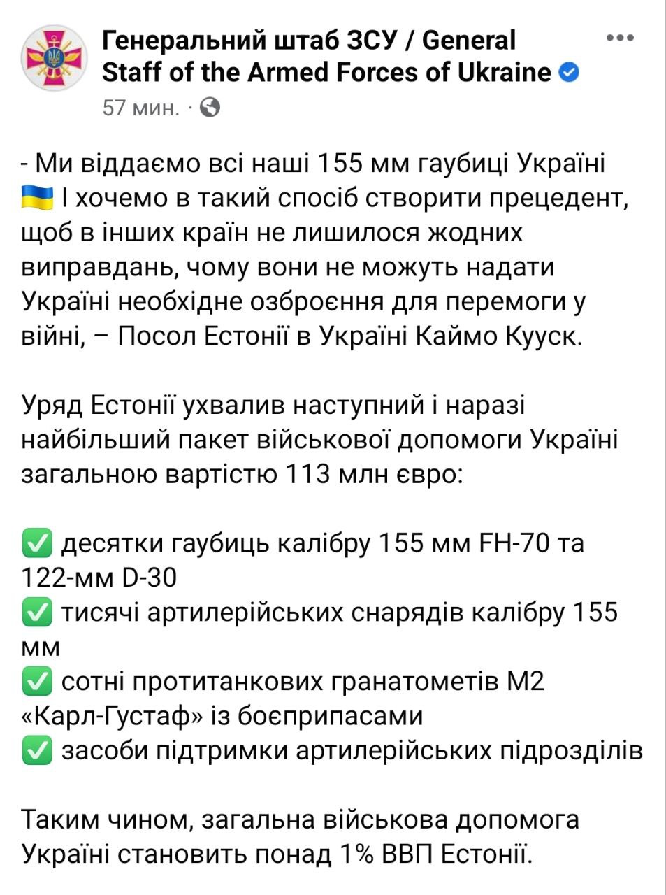 "Ми віддаємо всі наші 155 мм гаубиці Україні. І хочемо таким чином створити прецедент, щоб інші країни не мали жодних виправдань, чому вони не можуть надати Україні необхідне озброєння для перемоги у війні", – сказав посол Естонії в Україні Каймо Кууск.