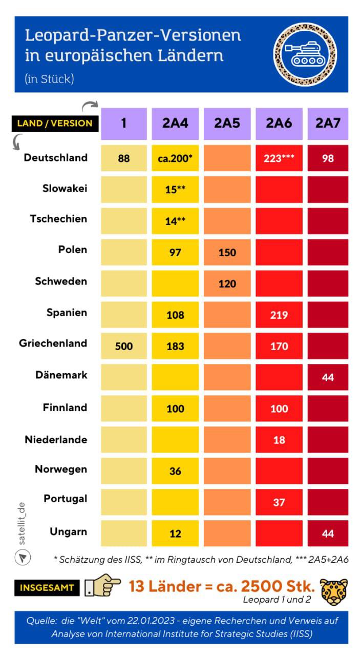 Найбільше танків найстарішої, першої версії, у Греції (500). Також у Афін багато Leopard 2A4 (183) та Leopard 2A6 (170). Найсучасніші 2A7 є у Німеччини (98 штук), Данії (44) та Угорщини (44)