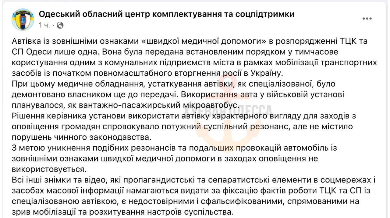 "Для уникнення подібних резонансів та подальших провокацій автомобіль із зовнішніми ознаками швидкої медичної допомоги в заходах оповіщення не використовується. Всі інші знімки та відео, пропагандистські та сепаратистські елементи в соцмережах та засобах масової інформації, що намагаються видати за фіксацію фактів роботи ТЦК та СП автомобілем, недостовірні та сфальсифіковані, спрямовані на зрив мобілізації та розхитування настроїв суспільства”, - йдеться у заяві.
