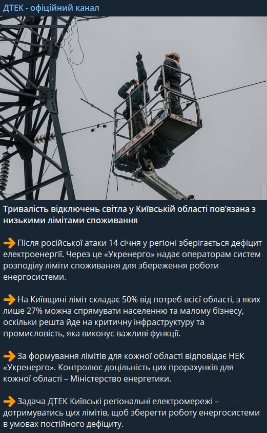 За даними ДТЕК, така ситуація в області зберігається після російської атаки 14 січня, коли енергосистему ледве вдалося врятувати. Тому Укренерго надає операторам систем розподілу ліміти споживання для збереження роботи енергосистеми.