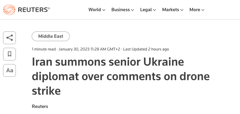 Нагадаємо, в ніч на 29 січня безпілотники атакували місто Ісфахан в Ірані. Незначні пошкодження отримав дах неназваного військового об'єкту. ЗМІ повідомляли, що дрони потрапили по військовому складу та заводу з виробництва моторної олії.
