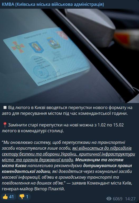 Замінити перепустку на новий можна з 1 лютого по 15-те у комендатурі Києва.