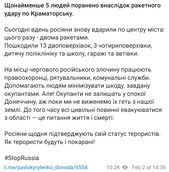 Подробиці сьогоднішнього обстрілу Краматорська, де ракети пошкодили 16 будинків, поліклініку та школу