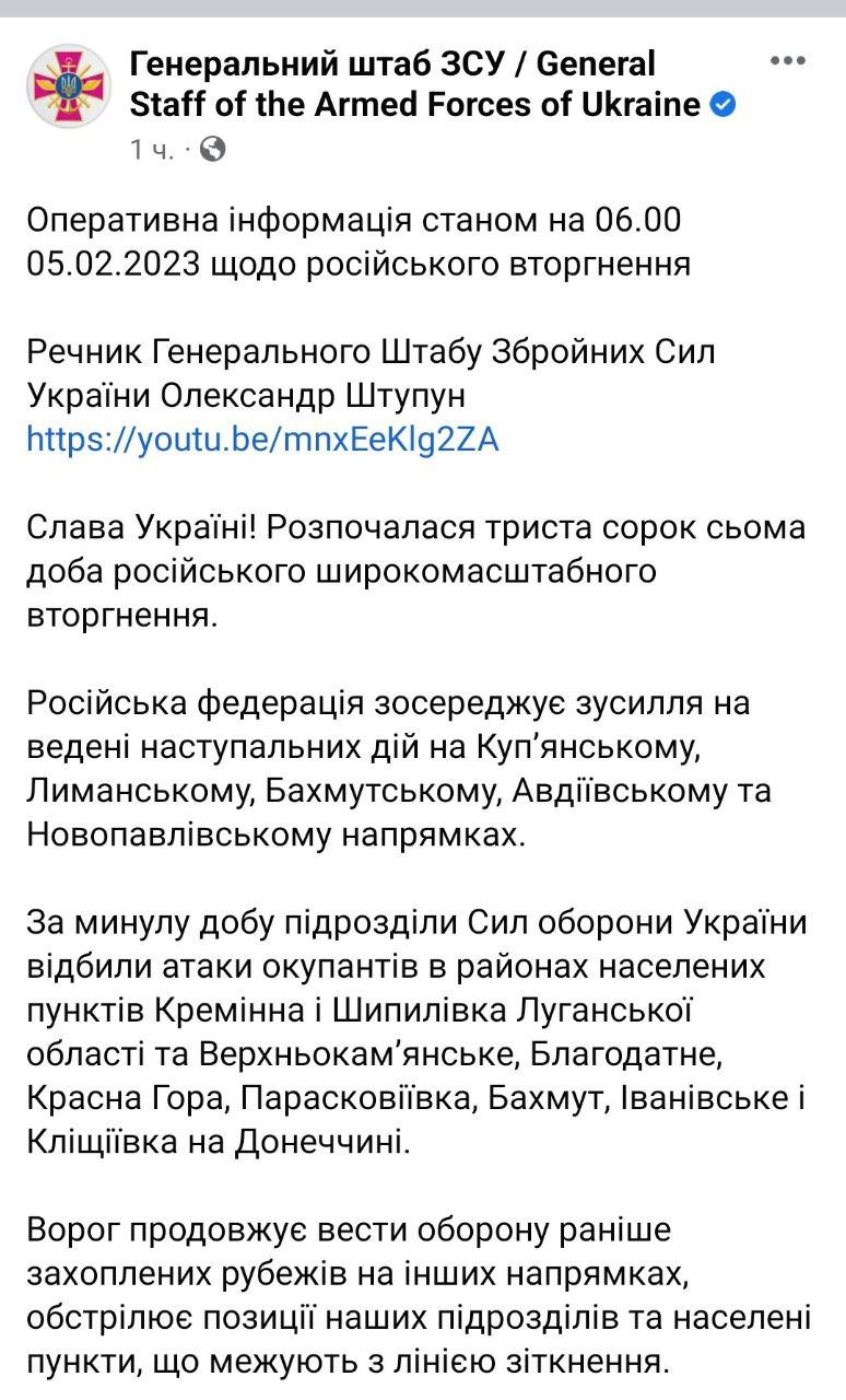 Війна в Україні триває вже 347 день. Ми слідкуємо за новинами 5 лютого у своєму онлайні.