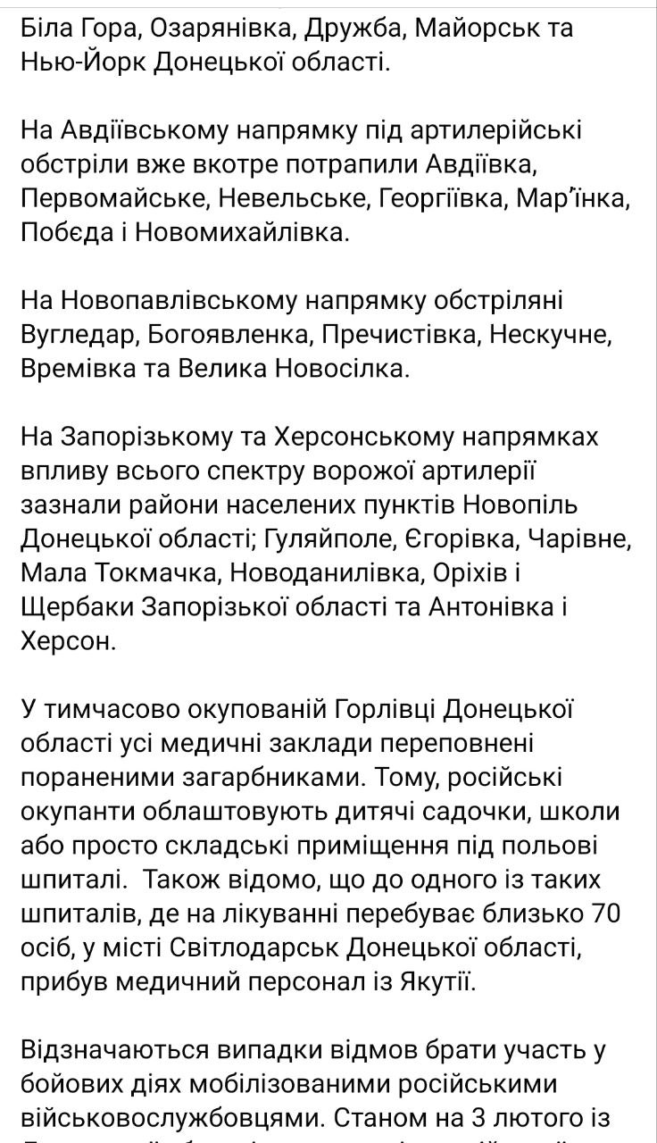 1. Росія настає вже на п'яти напрямках: Куп'янському, Лиманському, Бахмутському, Авдіївському та Новопавлівському.