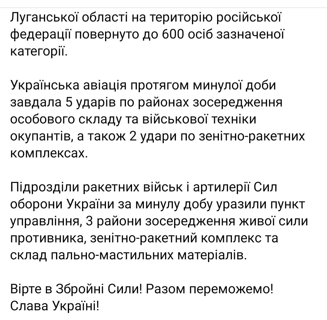 2. Відбито атаки противника в районах: Шипилівки та Кремінної Луганської області; Верхньокам'янського, Благодатного, Червоної Гори, Парасковіївки, Бахмута, Іванівського та Кліщівки Донецької області.