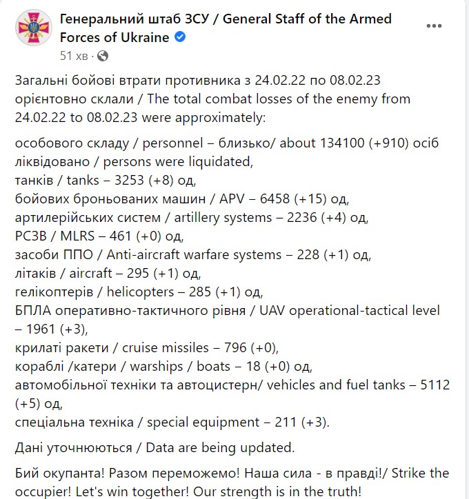 Генштаб Збройних сил України (ЗСУ) оприлюднив нове зведення про загальні бойові втрати російської армії за час повномасштабної війни в Україні - з 24 лютого 2022 року по 8 лютого 2023 року.