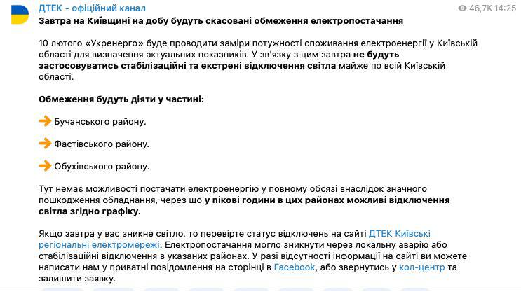 Обмеження все ж таки частково діятимуть у Бучанському, Фастівському та Обухівському районах, оскільки туди зараз неможливо постачати електроенергію в повному обсязі.