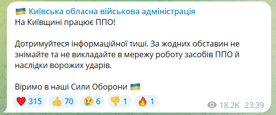 "У Київській області працює ППО. Дотримуйтесь інформаційної тиші. У жодному разі не знімайте і не викладайте в мережу роботу засобів ППО та наслідки ворожих ударів", - повідомила ОВА.