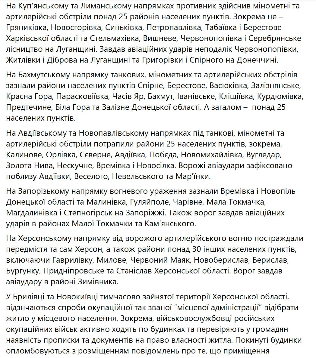 1. Напрями удару у росіян залишаються колишні – Куп'янське, Лиманське, Бахмутське, Авдіївське, Новопавлівське. Продовжує нарощувати угруповання на Лиманському та Бахмутському напрямках.