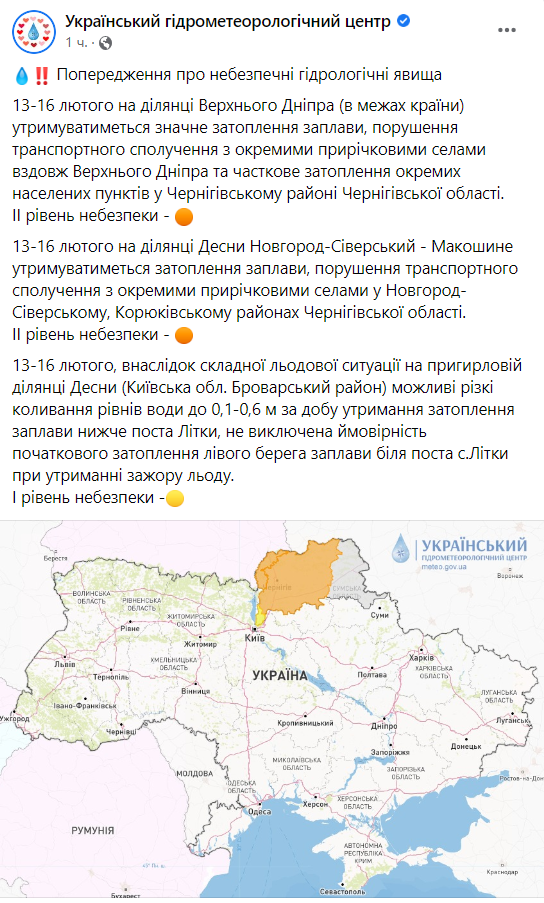 Так, з 13 по 16 лютого на ділянці Верхнього Дніпра (у межах країни) очікується значне затоплення заплави, що може порушити транспортне сполучення з окремими прирічними селами вздовж Верхнього Дніпра та частково затопити окремі населені пункти у Чернігівському районі Чернігівської області. Це другий рівень небезпеки.
