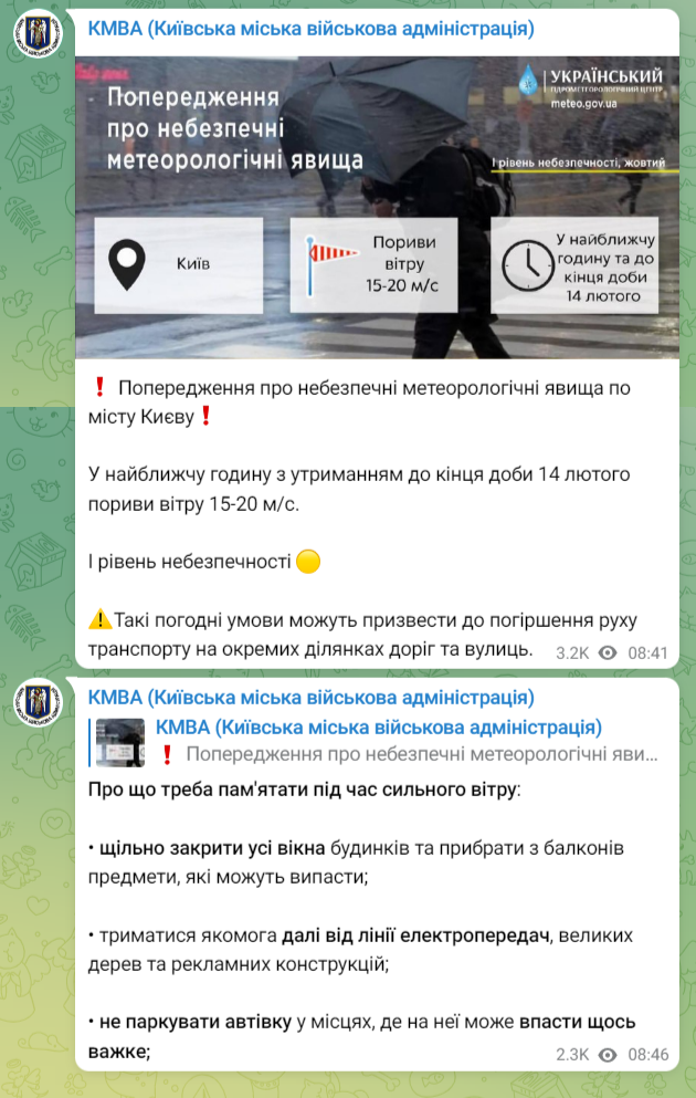 Кияни попереджають про небезпечні метеорологічні явища у столиці у вівторок, 14 лютого. Через очікувані сильні пориви вітру в Києві оголошено жовтий рівень небезпеки.