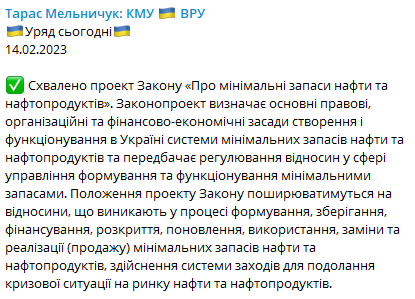 Кабінет міністрів України схвалив законопроект "Про мінімальні запаси нафти та нафтопродуктів".