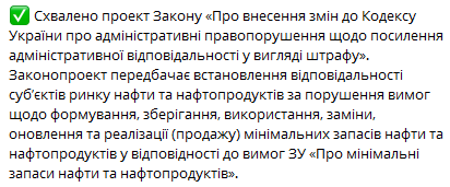 Крім того, Кабмін схвалив законопроект "Про внесення змін до Кодексу України про адміністративні правопорушення щодо посилення адміністративної відповідальності у вигляді штрафу". Законопроект передбачає встановлення відповідальності суб'єктів ринку нафти та нафтопродуктів за порушення вимог щодо формування, зберігання, використання, заміни, оновлення та реалізації мінімальних запасів нафти та нафтопродуктів відповідно до вимог вищевказаного законопроекту про мінімальні запаси.