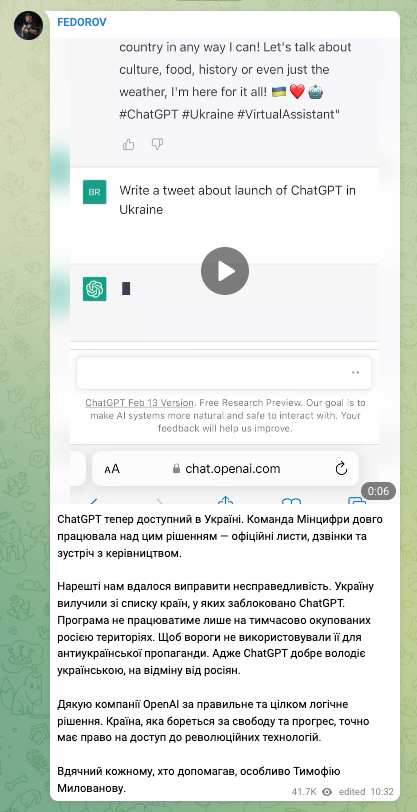 "Нарешті нам вдалося виправити несправедливість. Україну вилучили зі списку країн, у яких блоковано ChatGPT. Програма не працюватиме лише на тимчасово окупованих Росією територіях. Щоб вороги не використовували його для антиукраїнської пропаганди. Дякую компанії OpenAI за правильне та цілком логічне рішення. Країна, яка бореться за свободу та прогрес, має право на доступ до революційних технологій", - пише Федоров.