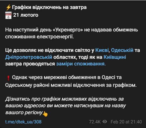 ""Укренерго" не надавав обмеження на споживання електроенергії. Це дозволяє не відключати світло в Києві, Одеській та Дніпропетровській областях, у той час як у Київській області завтра проводяться виміри споживання. Однак через мережеві обмеження в Одесі та Одеському районі можливі відключення по графіку", - йдеться у повідомленні.