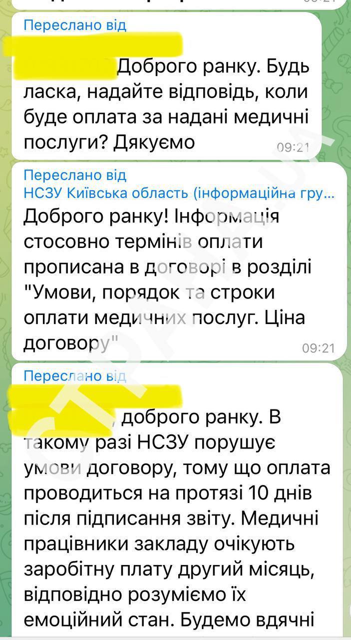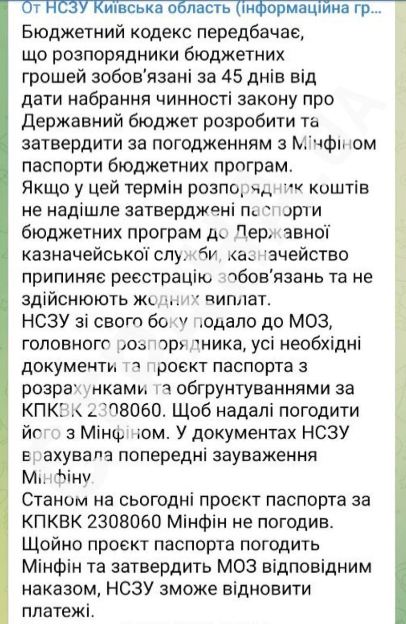 У розпорядженні "Країни" також виявилася відповідь НСЗУ, яку служба розіслала всім медустановам: "НСЗУ зі свого боку подало до МОЗ, головний розпорядник, усі необхідні документи та проект паспорта з розрахунками та обґрунтуваннями щодо УПКЗК 2308060. Щоб надалі погодити його з Мінфіном. У документах НСЗУ врахувала попередні зауваження Мінфіну. На сьогоднішній день проект паспорта з КПКВК 2308060 Мінфін не погодив. Як тільки проект паспорта погодить Мінфін та затвердити МОЗ відповідним наказом, НСЗУ зможе відновити платежі".