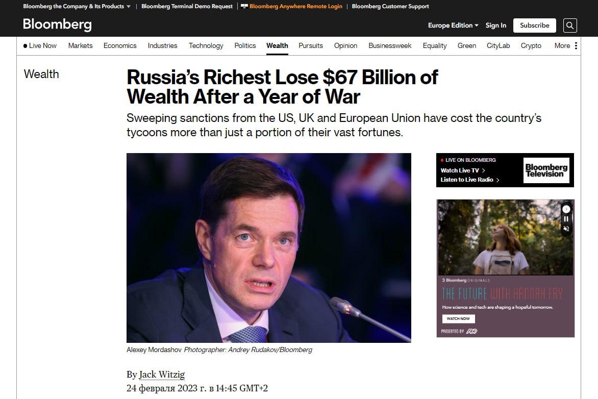 За рік із моменту вторгнення РФ в Україну російські мільярдери втратили 20% свого статку.