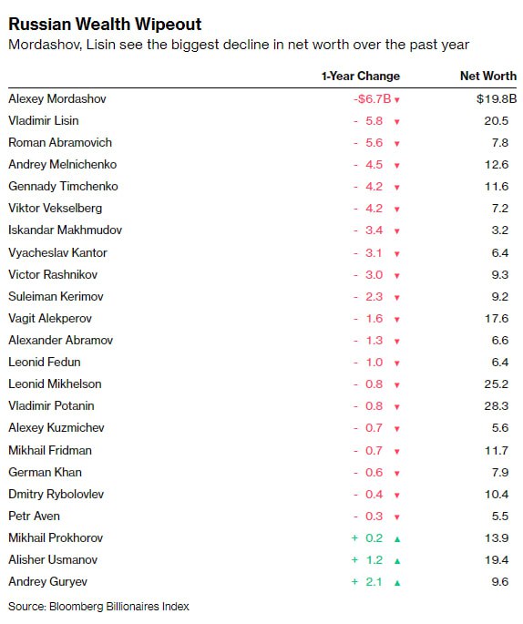 Найбільших втрат зазнав Олексій Мордашов, основний власник ПАТ "Северсталь", одного з найбільших виробників стали в Росії - мінус 6,7 мільярда доларів з початку війни. Але з позначкою в 19,8 мільярда доларів він все ще залишається четвертою найбагатшою людиною в РФ.