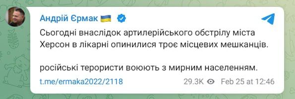 Раніше у Херсонській ОВА повідомили, що внаслідок артилерійських обстрілів 23 лютого було пошкоджено теплову мережу Херсона, через що місто залишилося без опалення. Відновити його обіцяють до неділі, 26 лютого.