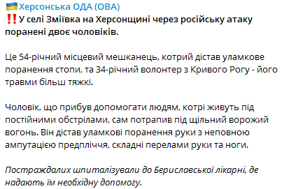 У селі Зміївка Херсонської області через російську атаку поранено двох чоловіків. Серед них є волонтер із Кривого Рогу.
