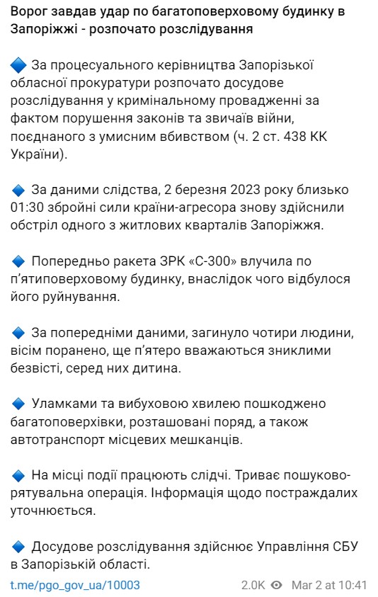 Попередньо сталося попадання російської ракети С-300 по будівлі. Прокуратура розпочала досудове розслідування щодо кримінального провадження за фактом порушення законів та звичаїв війни, поєднаного з умисним вбивством (ч. 2 ст. 438 КК України).