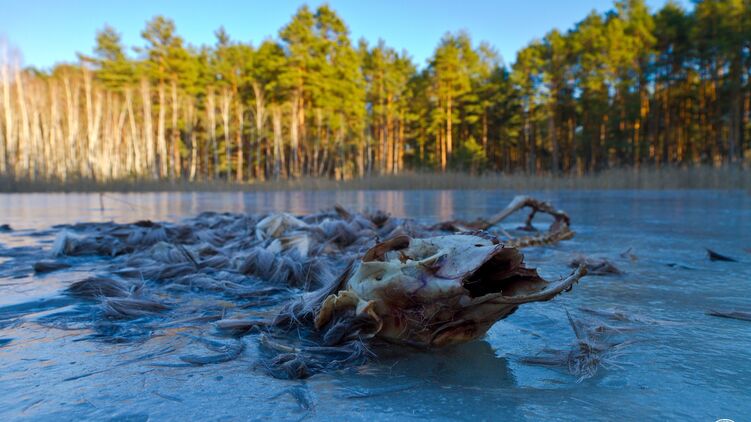 Проза життя природи. Чорнобильський заповідник показав мальовничі останки оленя, що вмерз у лід.