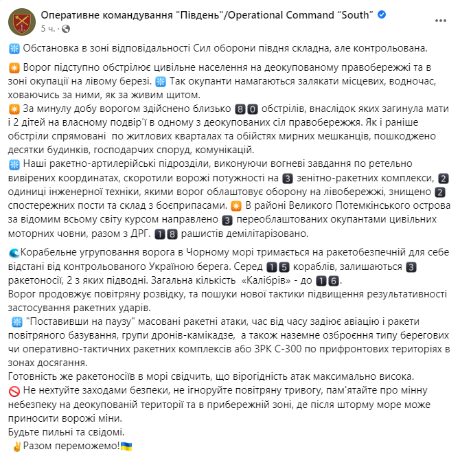 Про це повідомляє Оперативне командування "Південь" у своєму Facebook.