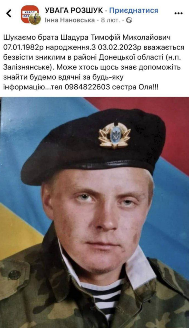 Раніше інформацію про те, що це саме він опублікували в соцмережах. Родичі Шадури заявили про його зникнення та сподівалися знайти інформацію про Тимофія. Повідомлялося, що він зник у районі Залізнянського під Бахмутом.