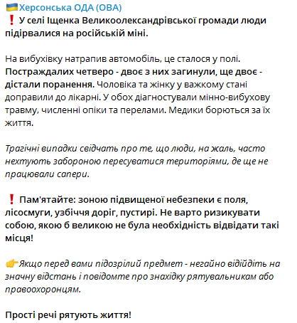 У селі Іщенко Великоолександрівської громади Херсонської області люди вибухнули на російській міні. На вибухівку у полі натрапив автомобіль. У машині були четверо - двоє з них загинули, ще двоє - отримали поранення.