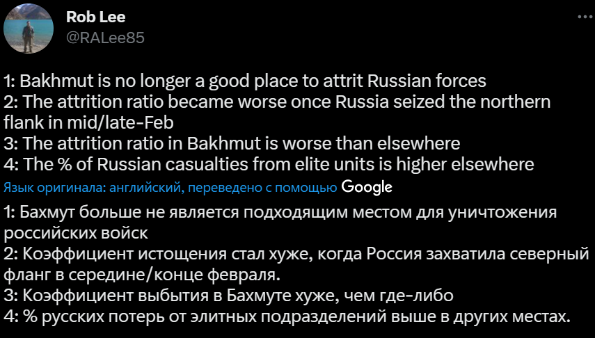 Визнаючи, що рівень втрат РФ у Бахмуті вищий, ніж в інших місцях, він стверджує, що "Бахмут більше не є слушним місцем для знищення російських військ". І українські війська також зазнають суттєвих втрат.