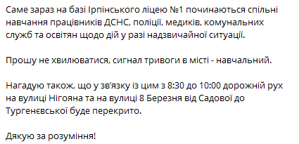 "Саме зараз на базі Ірпінського ліцею №1 розпочинаються спільні навчання працівників ДержНС, поліції, медиків, комунальних служб та педагогів щодо дій у разі надзвичайної ситуації. Прошу не хвилюватися, сигнал тривоги у місті – навчальний", – повідомив він у телеграм-каналі.