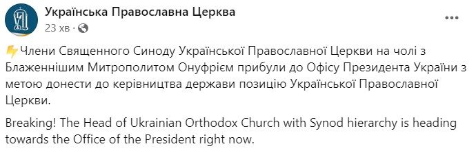 Вони "прибули до Офісу Президента України з метою донести до керівництва держави позицію Української Православної Церкви".