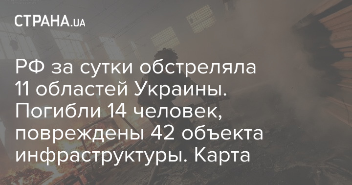 РФ за добу обстріляла 11 областей України. Загинули 14 людей, пошкоджено 42 об'єкти інфраструктури. Карта