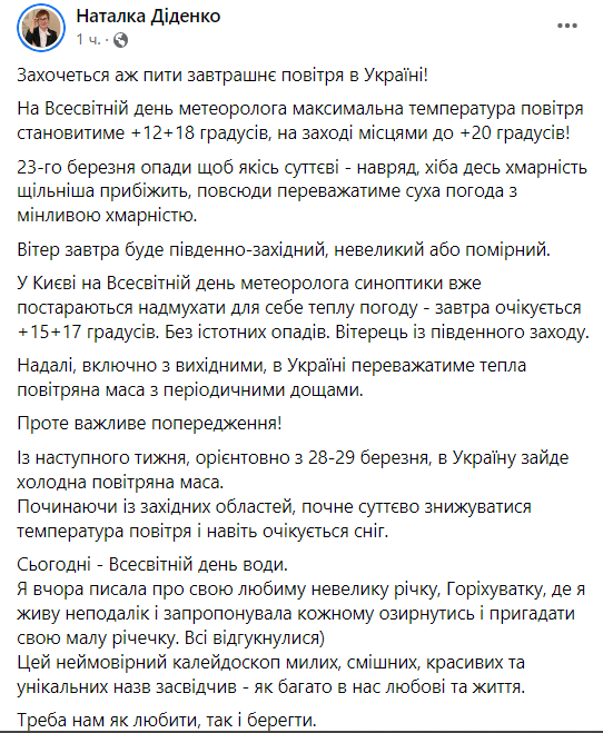 Вона також попередила, що з 28-29 березня в Україну зайде холодна повітряна вага. Починаючи із західних областей, почне істотно знижуватися температура повітря і навіть очікується сніг.