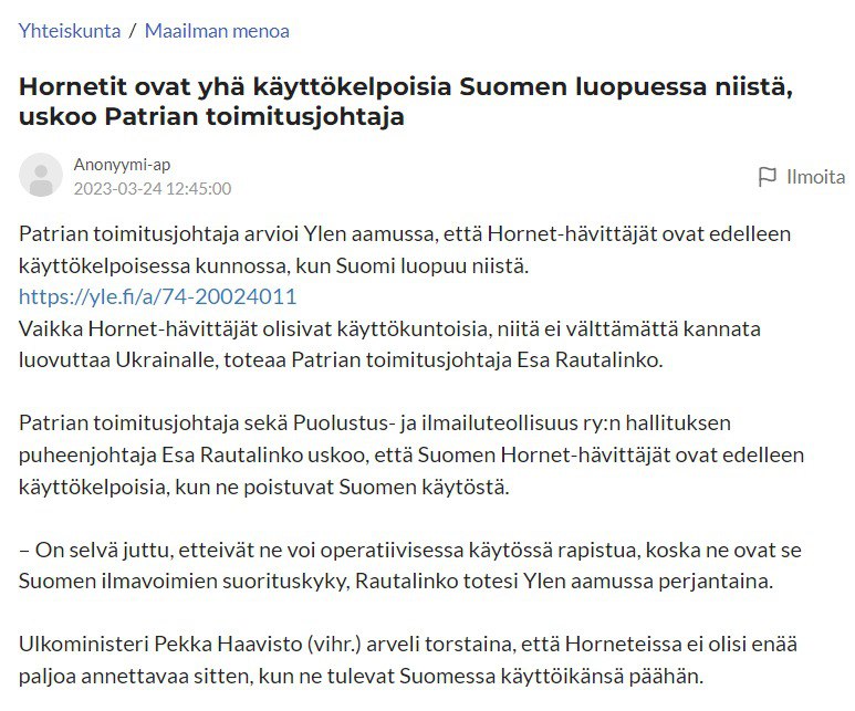 При цьому міністр закордонних справ Пекка Хаавісто (зелений) сказав, що "Хорнетс" буде малоефективним після закінчення терміну служби у Фінляндії.