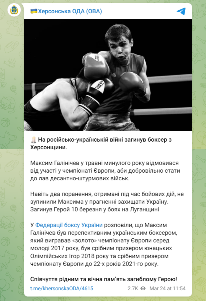 На війні загинув боксер із Херсонської області Максим Галинічев. У травні він відмовився від участі у чемпіонаті Європи та пішов добровольцем до десантно-штурмових військ.