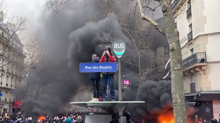 На відео з Парижа видно, як потужні клуби чорного диму від багаття заволокли вулиці. Поліція б'є і тіснить протестувальників, у хід ідуть палиці та сльозогінний газ.